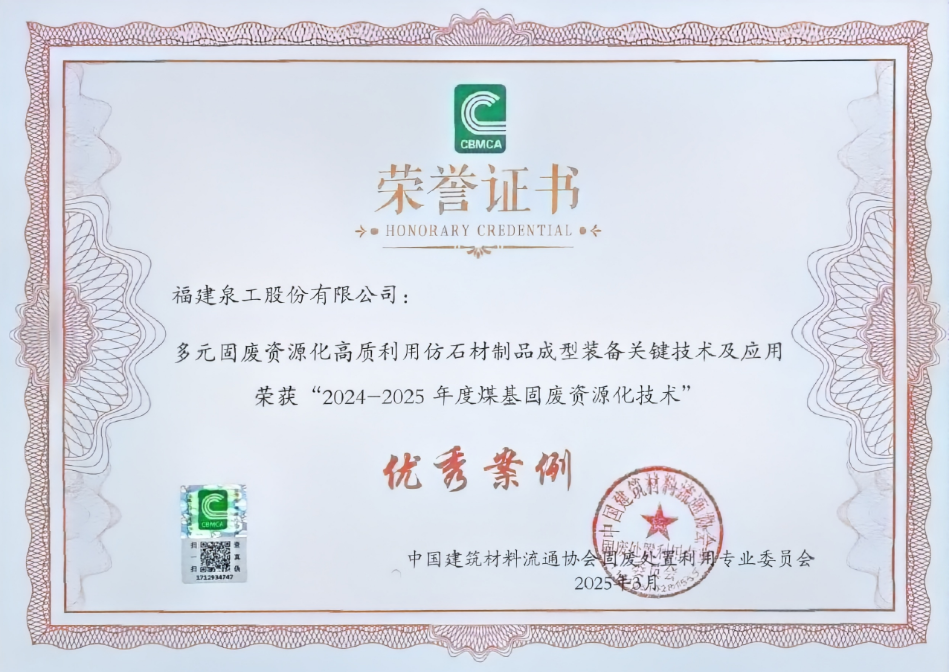 會議期間,泉工股份的“多元固廢資源化高質利用仿石材制品成型裝備關鍵技術及應用”案例成功榮獲2024-2025年度煤基/冶金固廢資源化技術優(yōu)秀案例。據悉,此次評選旨在表彰在固廢資源化利用領域具有創(chuàng)新性和示范性的技術與應用,推動行業(yè)規(guī)?;透咧祷l(fā)展,培育發(fā)展固廢綜合利用新質生產力。